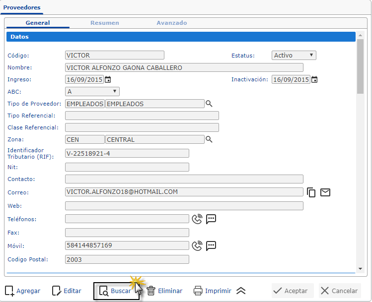 La sección de Información General contiene los datos personales del proveedor y los datos de la cuenta bancarias. Los campos contenidos son los siguientes: