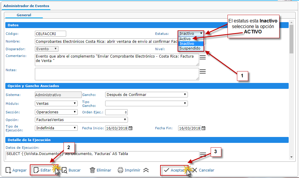 c. Después verificamos que el Estatus este Activo para que se le pueda mostar la pantalla antes de generar la factura, si no esta activo seleccione el botón