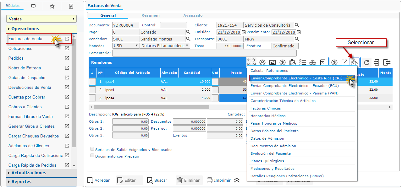 y presionaremos la opción Enviar Comprobante Electrónico - Costa Rica (CRI).