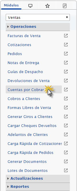 b. Después de haber ingresado a eFactory nos ubicamos en el menú, desplegamos la lista y seleccionaremos el módulo de Ventas, desplegamos el componente Operaciones y activamos la opción de Cuentas por Cobrar.