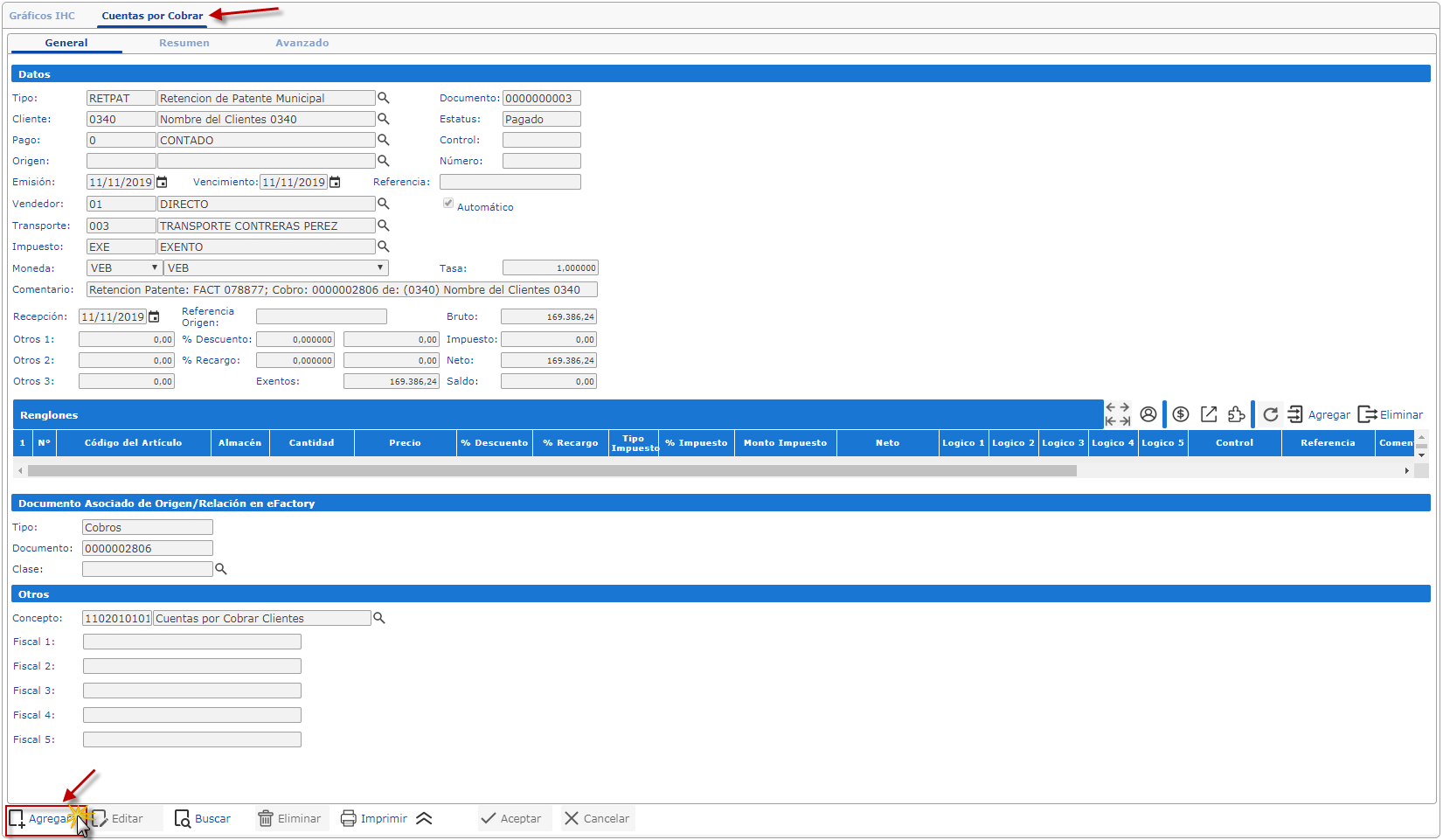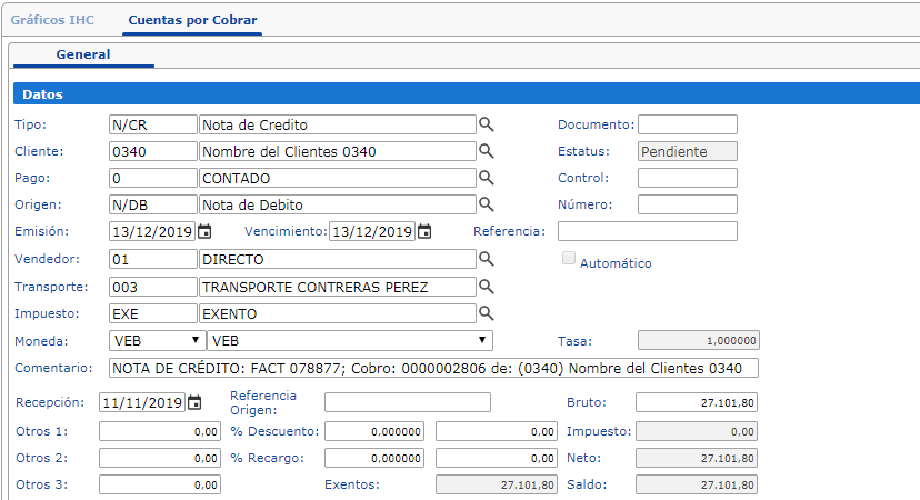 a. Seguidamente se abrirá el panel de Cuentas por Cobrar, por defecto en este panel estará la información del último registro hecho en esta opción.