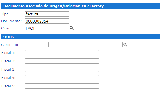 b. Sección Documento Asociado de Origen/Relación en eFactory: En la Sección Documento Asociado de Origen/Relación en eFactory encontrará los siguientes campos: Tipo: FACTURAS, Documento: Número del Documento, Clases: FACT.