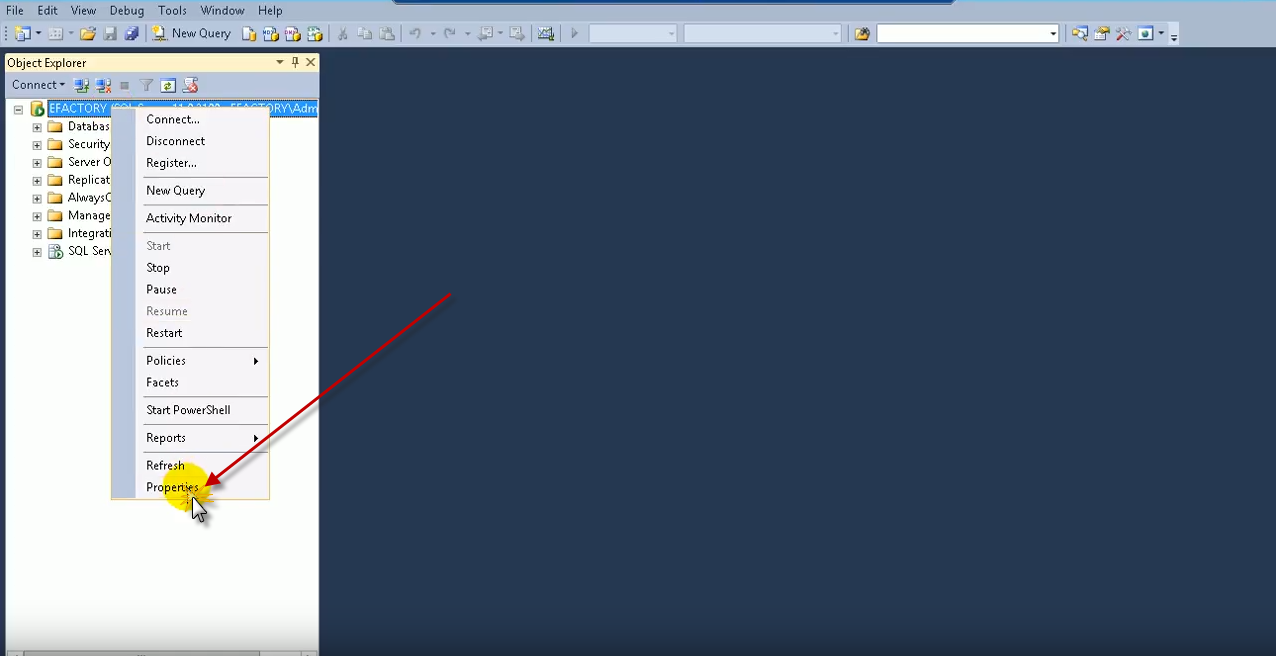 Al hacer clic derecho a EFACTORY (SQL Server 11.0.2100 - EFACTORY\Administrator) se desplega un panel, donde se debe seleccionar Properties.