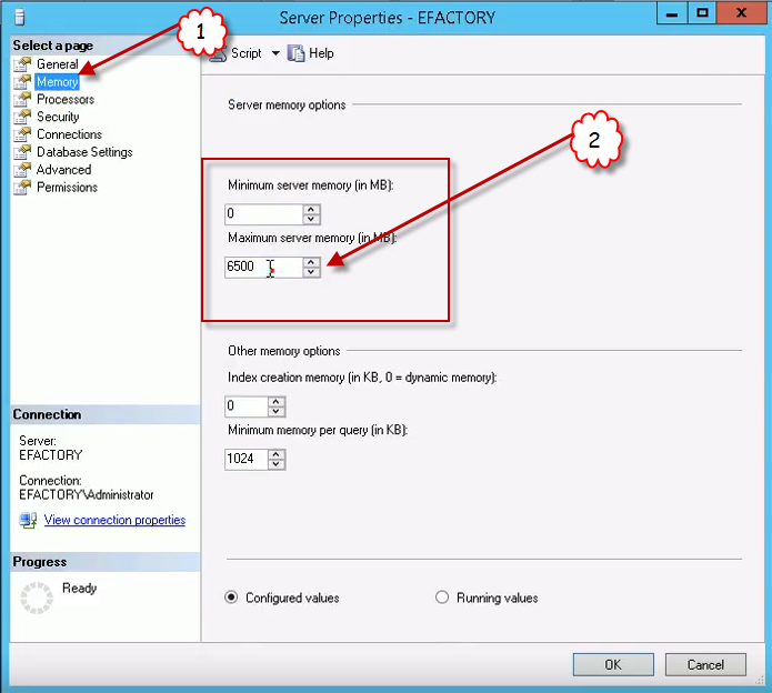 Al ubicar Maximum server memory (in MB) procedemos a editar el tamaño de la Memoria RAM y procedemos a seleccionar el botón OK.