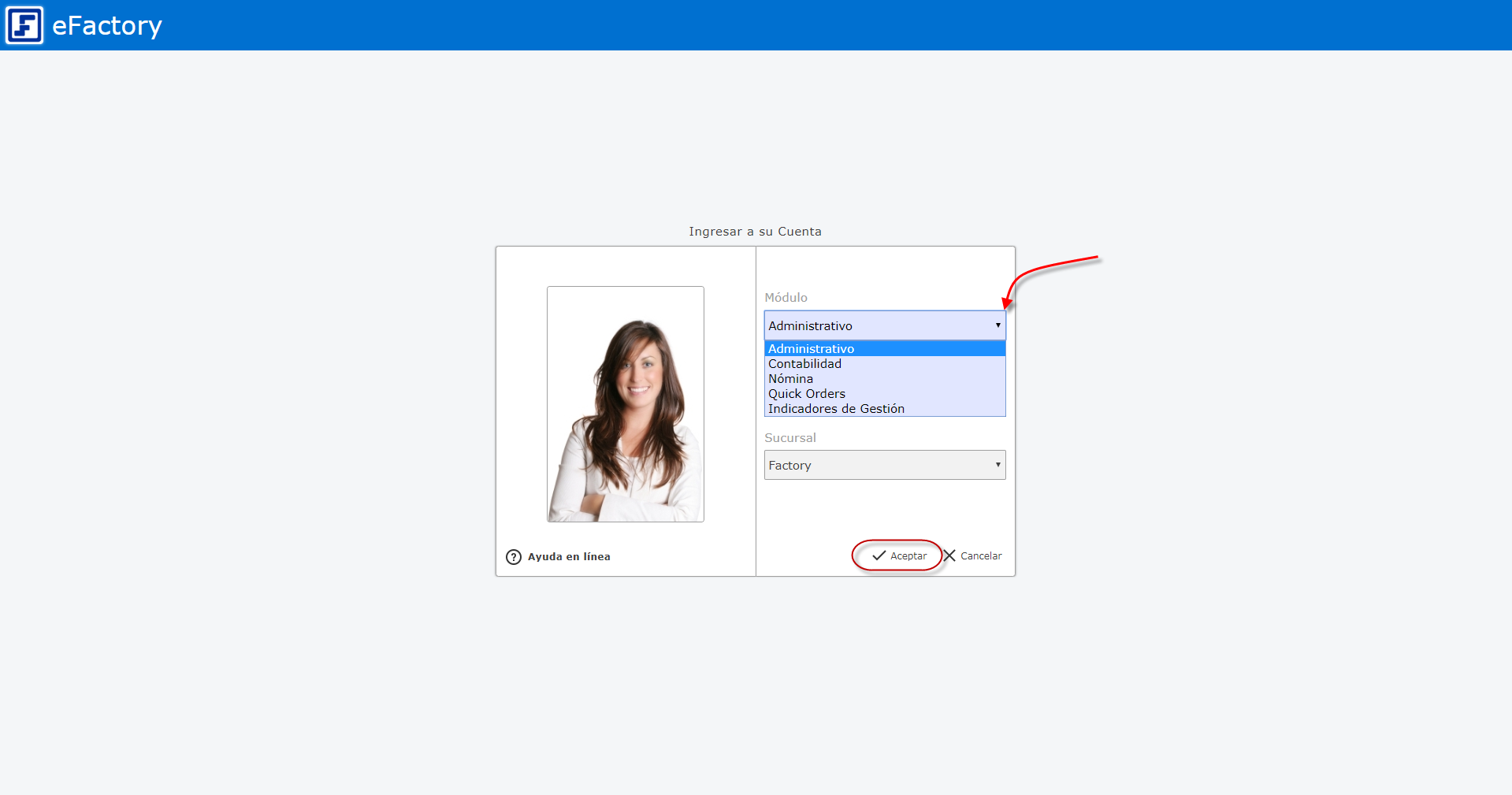 Luego en la lista desplegable del menú seleccionaremos Módulo Administrativo, Empresa y Sucursal de la empresa y presionaremos el botón