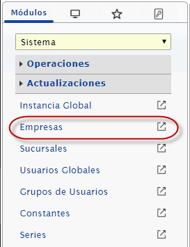 b. Después de haber ingresado a eFactory nos ubicamos en el menú, desplegamos la lista y seleccionaremos el módulo de Sistema, desplegamos el componente Actualizaciones y activamos la opción de Empresas.