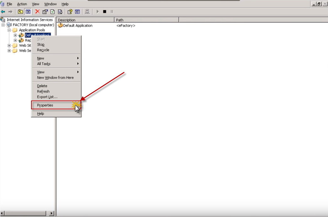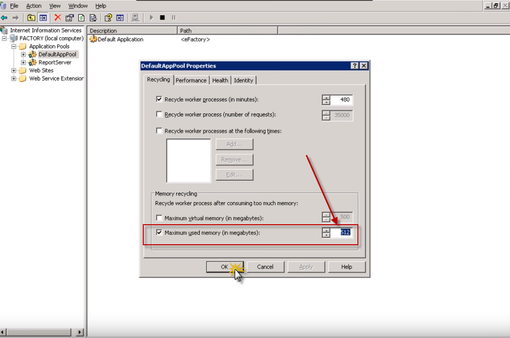 Después de presionar Properties se muestra la ventana de DefaultAppPoolProperties y ubicamos donde nos dice sobre el consumo de memoria RAM.