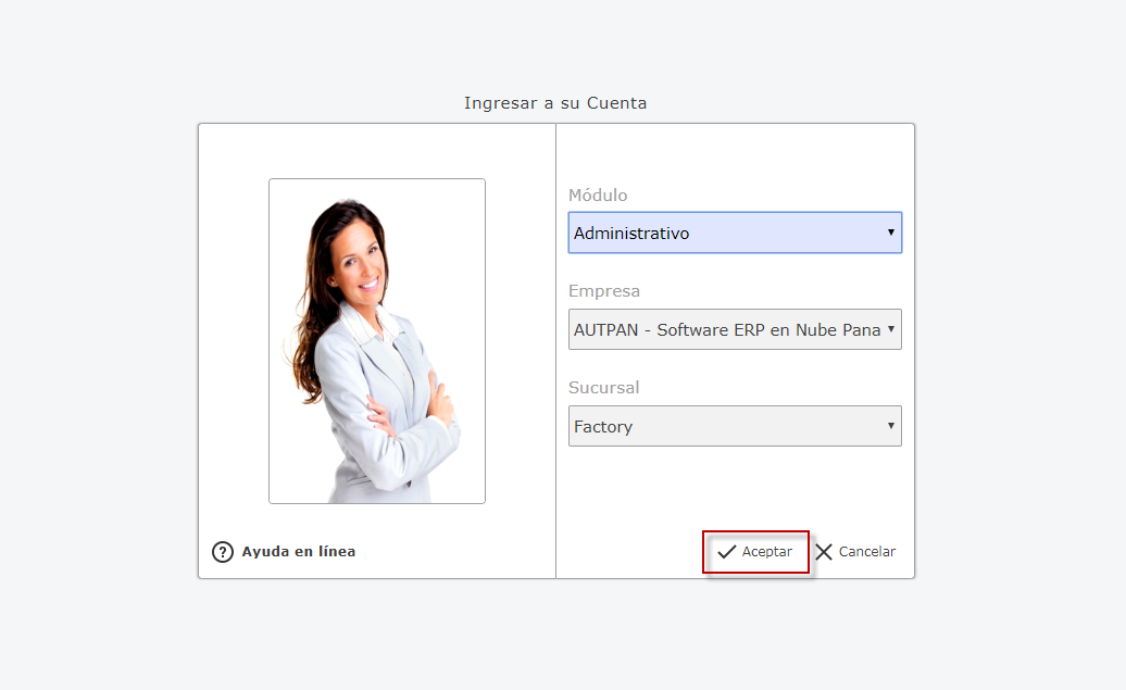 luego Seleccionamos el Módulo Administrativo, Empresa y Sucursal de la Empresa y presionamos el botón
