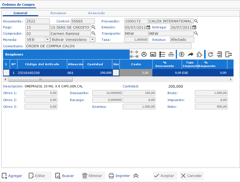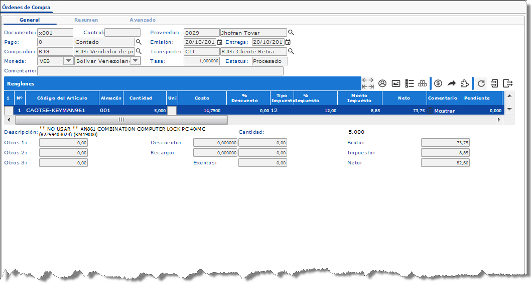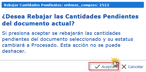 Rebajar pendientes, es una funcionalidad que permite eliminar las cantidades pendientes en el actual documento contra el documento de origen. Como ejemplo concreto, si creamos una orden de compra por 100 unidades y ya estaba generada una factura de compra por 60 de esa misma orden y el proveedor indica que no tiene más existencias y no podrá reponer las 40 unidades faltantes, procedemos a rebajar las unidades pendientes de la orden de compra para no dejarla abierta. Esta función se ubica en la ficha Avanzado de los siguientes formularios: