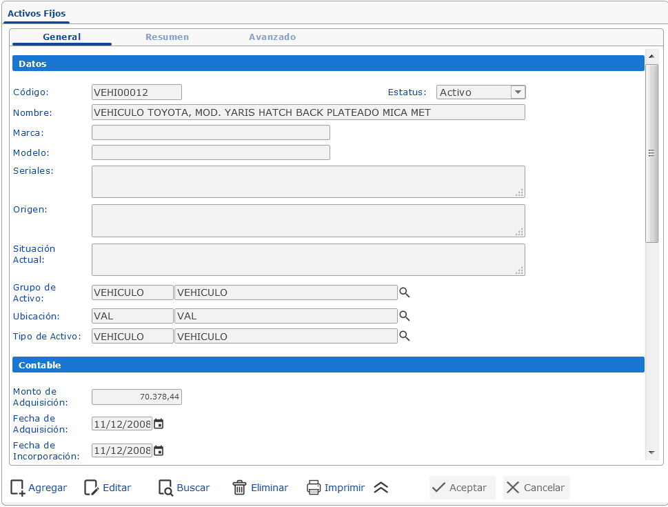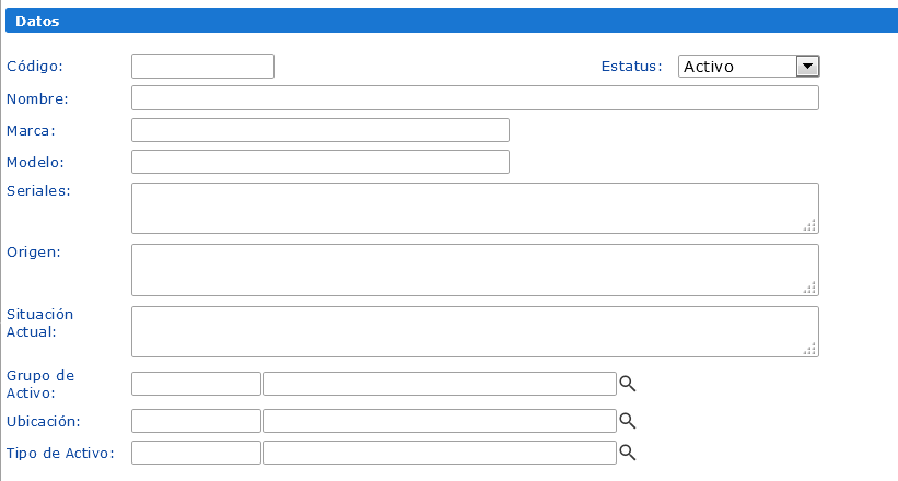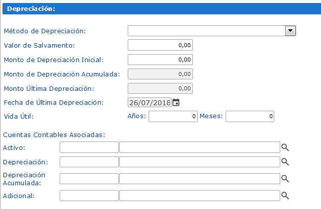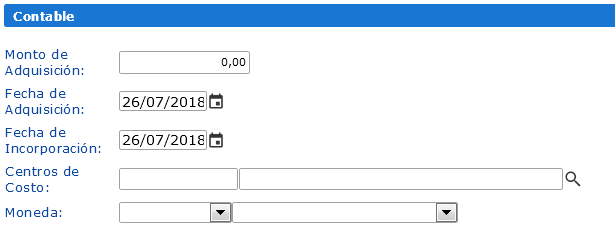 Como no todos los activos manejan las mismas características, no todos los campos de esta sección son obligatorios, sin embargo, como buena costumbre en control contable no obvie los campos no obligatorios cuando registre aquellos bienes que requieran de estos valores.