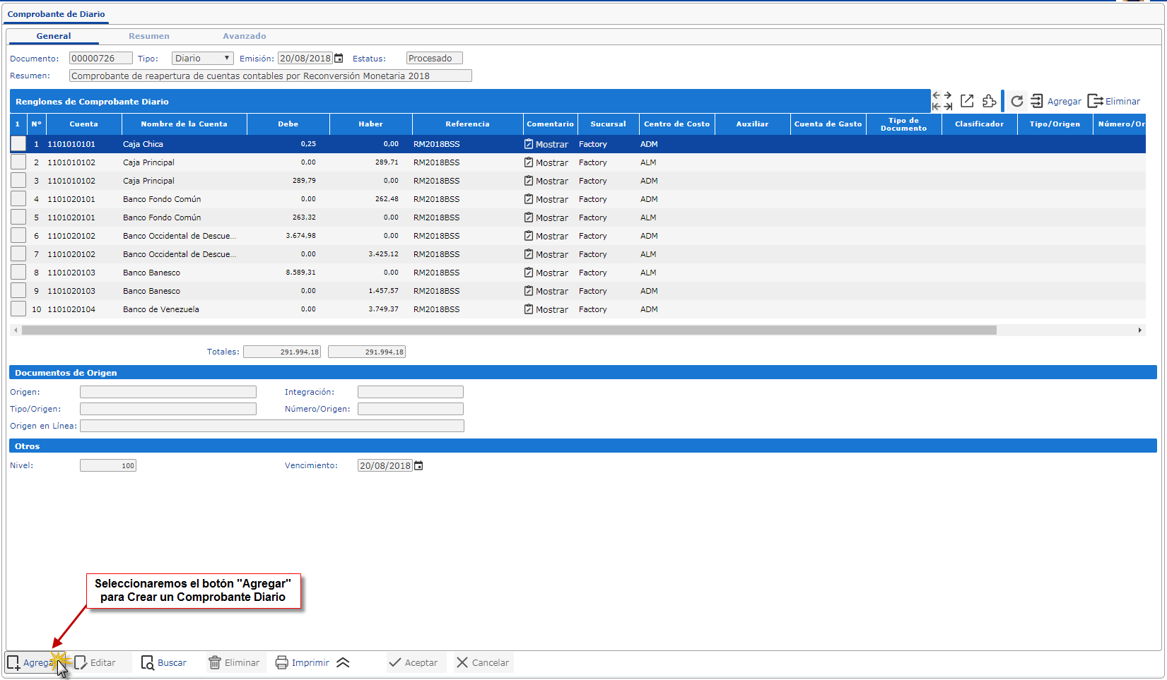 a. Ingrese al módulo Contabilidad, sección Operaciones, se observa la pantalla de Comprobante Diario y presionaremos el botón