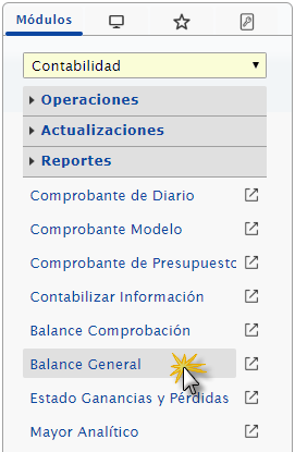 b. Para general un balance general tenemos que ubicar el módulo de Contabilidad, desplegamos el componente Reportes, activamos el maestro Balance General.