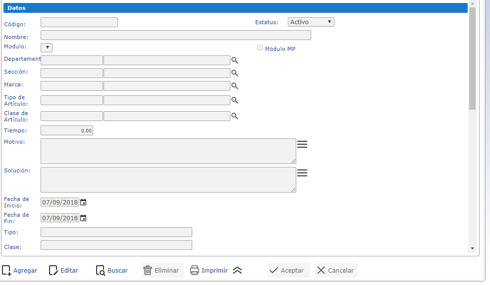 Es un instrumento que permite definir y administrar las fallas que se presentan en la organización, a través de la recolección de los datos que describen el motivo, la duración, valor y solución de la falla, en este mismo sentido, permite recoger los datos del departamento y sección afectados. Esta herramienta se encuentra ubicada en el módulo MP, sección Actualizaciones, opción Fallas.