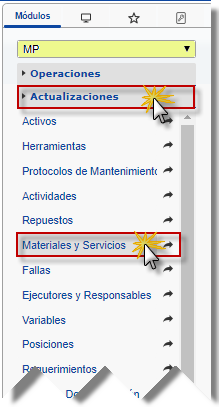 Es una herramienta multifuncional que permite definir y administrar los materiales y los servicios que se utilizaran en el mantenimiento preventivo y correctivo. Esta funcionalidad se encuentra ubicada en el módulo MP, sección Actualizaciones, opción Materiales y Servicios.