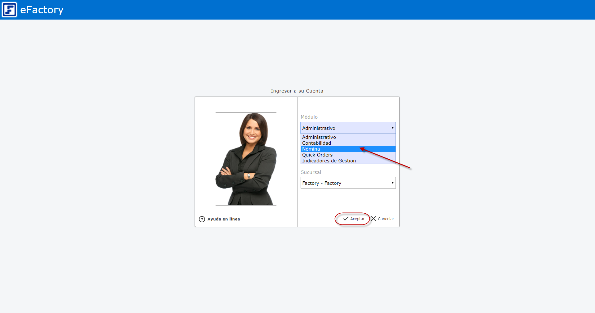 a. Primero debemos ingresar al sistema de Nómina de eFactory colocando nuestro usuario y contraseña en la pantalla inicial de eFactory, luego presionaremos el botón de "Iniciar Sesión" y seleccionaremos el sistema de "Nómina",