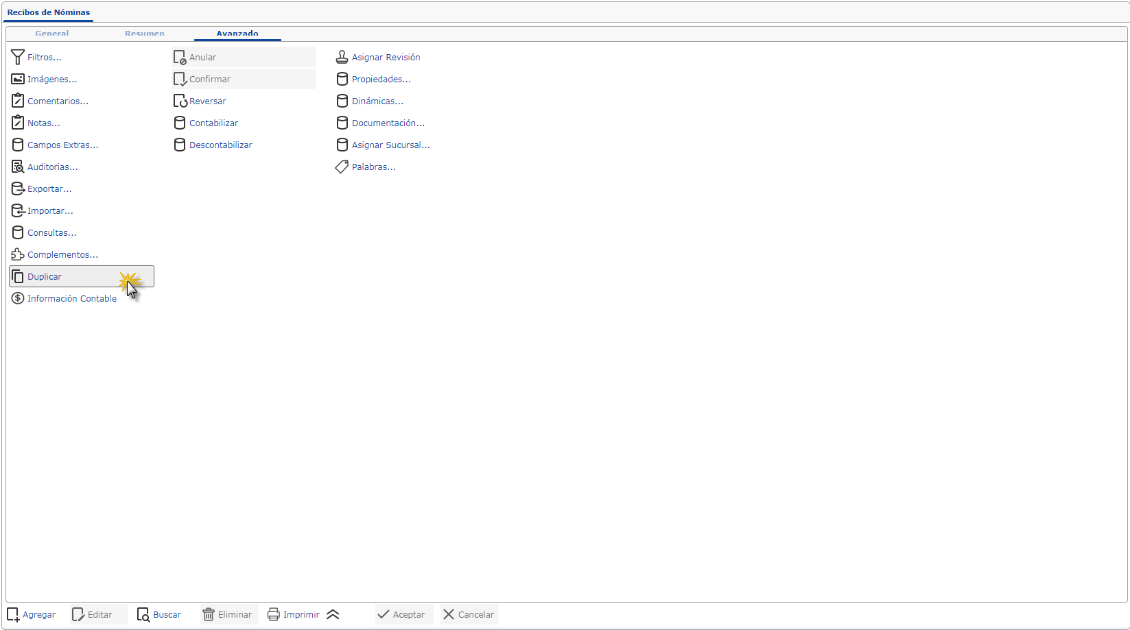 ubicado en la parte inferior de la pantalla Recibos de Nóminas y seleccionar un