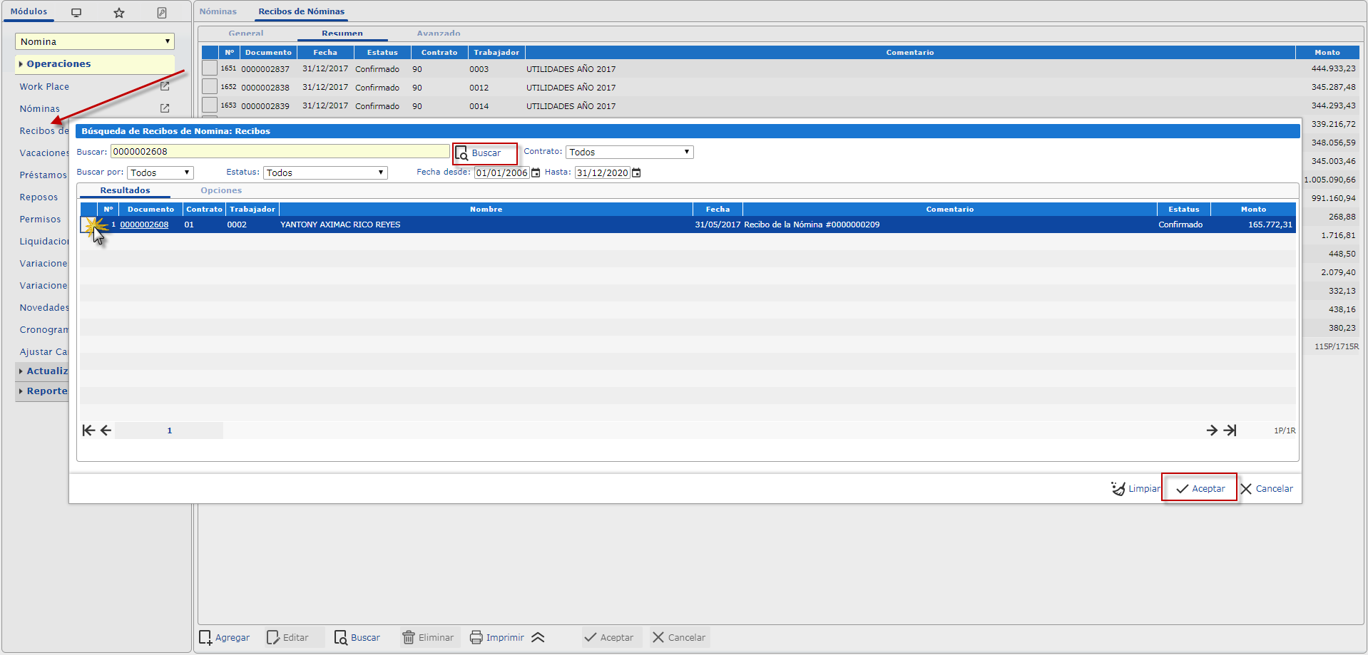 y Buscamos el recibo de nómina a imprimir.