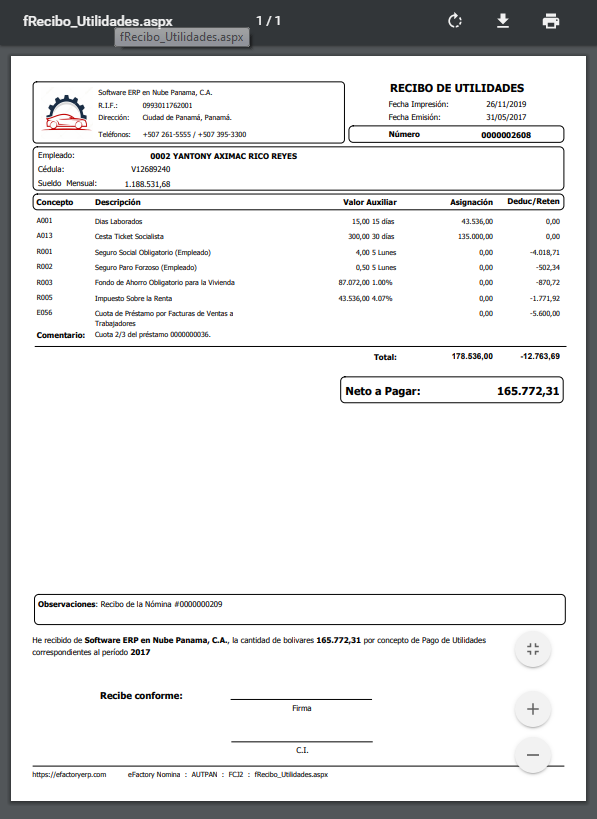 c. Luego podemos observar el Recibo de Utilidades de Nóminas.