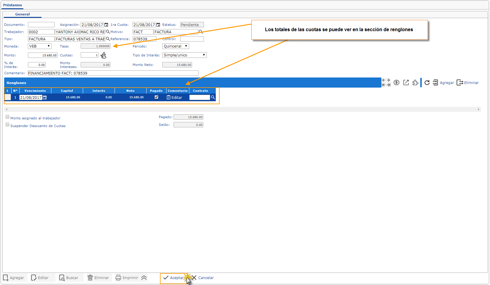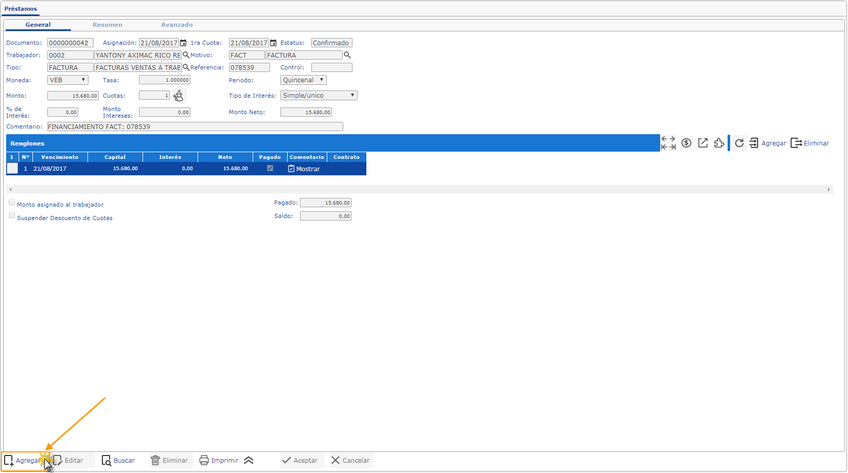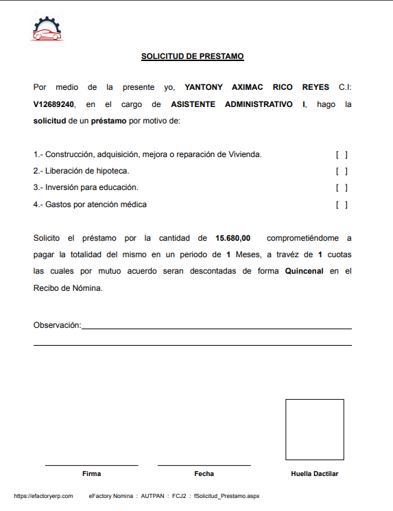 Te explicamos cómo generar un préstamo a un trabajador con eFactory Nómina. Un préstamo realizado a un trabajador, será pagado por el mismo mediante dos o más cuotas. En el documento de préstamo se indica la fecha en la que se asignará el monto del préstamo al trabajador, y las fechas y montos de las cuotas a pagar, los contratos de sueldos y salarios harán la asignación del monto del préstamo al generar la nómina de la fecha indicada, y harán las deducciones de las cuotas en las nóminas siguientes cuando coincidan con las fechas de las mismas; cuando cada cuota sea deducida en el contrato correspondiente se marcará la misma como pagada, reduciendo el saldo pendiente por pagar.