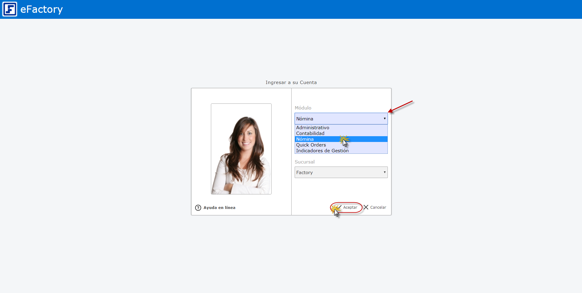 Primero debemos ingresar al sistema de Nómina de eFactory colocando nuestro usuario y contraseña en la pantalla inicial de eFactory, luego presionaremos el botón de "Iniciar Sesión" y seleccionaremos el sistema de "Nómina",