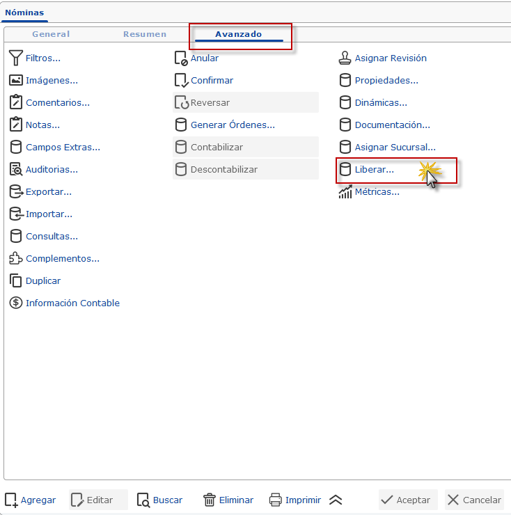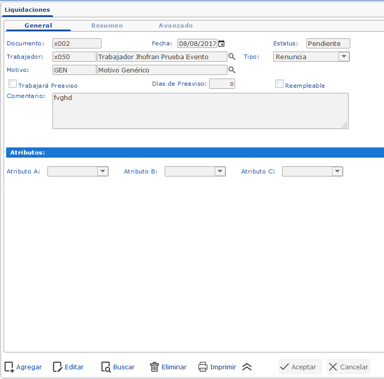Liquidaciones: Cuando un trabajador termina su relación laboral con la empresa se registra un documento de Liquidación. Este indica la fecha en que la liquidación se hará efectiva, y es usada por los contratos de sueldos y salarios para limitar los pagos hasta esa fecha. Adicionalmente, este documento es usado por el contrato "92 - Liquidaciones" para indicar la fecha de corte para el cálculo del monto de liquidación; en este último contrato, el Tipo y el Motivo de la liquidación pueden afectar el monto final de la misma.