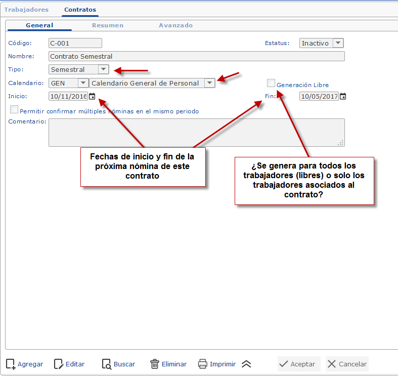 Los contratos solo requieren algunos campos para funcionar. El primero es el Tipo, que indica la frecuencia con la que se aplica el contrato, aunque al momento de generar el contrato se puede cambiar las fechas de Inicio y Fin manualmente. El Calendario se usa para indicar los días laborables y festivos del contrato, pudiendo asignarse un calendario para empleados que trabajen de lunes a viernes y otro para quienes trabajen de martes a sábado, por ejemplo. Para los contratos de sueldos y salarios la casilla Generación Libre se deja sin marcar, indicando que el contrato solo se aplicará a los empleados que lo tengan asignado.