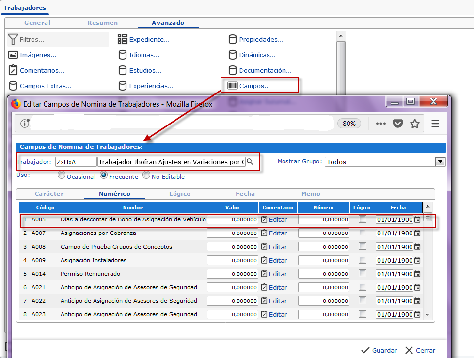 Los campos marcados como uso Ocasional almacenan valores que se asignan una vez al trabajador y que mantendrán el mismo valor hasta que sean cambiados de nuevo manualmente.