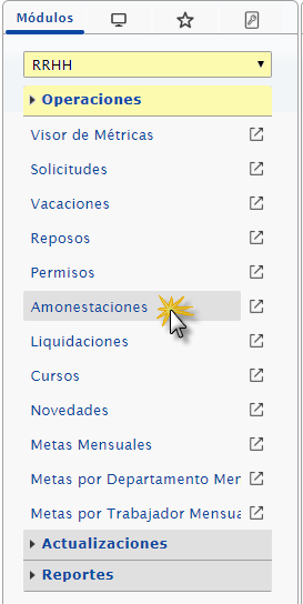 b. En el módulo RRHH, desplegamos el componente Operaciones, activamos el sub componente Amonestaciones.