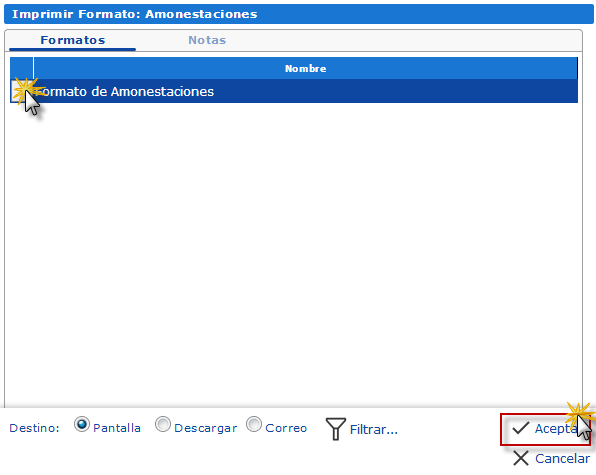 Imprimir Amonestaciones Para realizar esta operación sólo debes seleccionar el renglón que desees y presionar el boton imprimir, luego te aparecerá una ventana donde debes seleccionar el formato de impresión, en este caso es el de amonestaciones, presiona el botón aceptar y enseguida se generará en formato PDF el documento con toda la información que llenaste en el formulario.