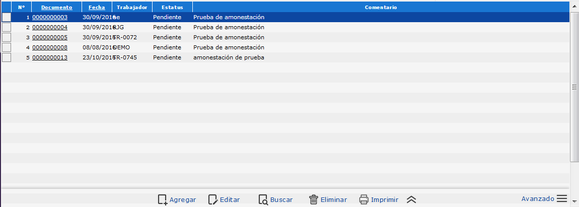 Luego de acceder con tus datos al módulo de Nómina, debes entrar en la sección RRHH, en la ficha de Operaciones encontrarás el formulario Amonestaciones, al hacer clic aparecerá una ventana en la cual podrás agregar, editar, eliminar, e imprimir las amonestaciones de tus empleados.