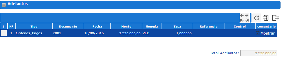 La sección de Adelantos se divide en diferentes renglones, que contienen los siguientes campos: