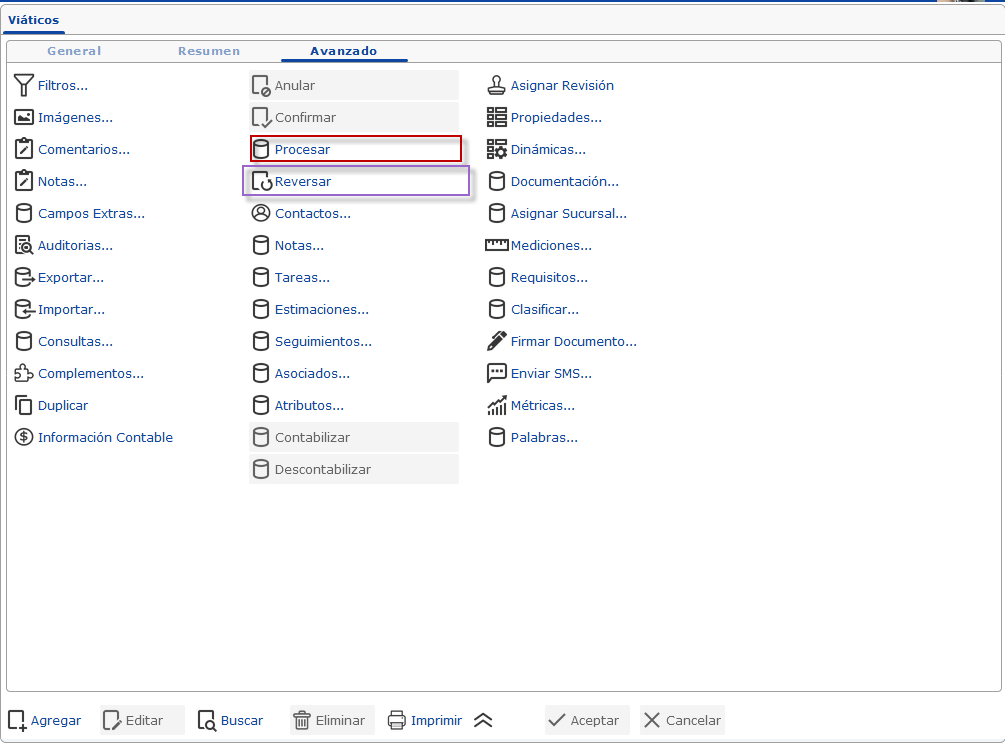 , para abrir una ventana de búsqueda que mediante la utilización de los distintos filtros o escribiendo el código del documento puede ubicar el documento de viáticos y seleccionarlo haciendo clic en la casilla ubicada al lado izquierdo del documento y posteriormente presionando Aceptar.