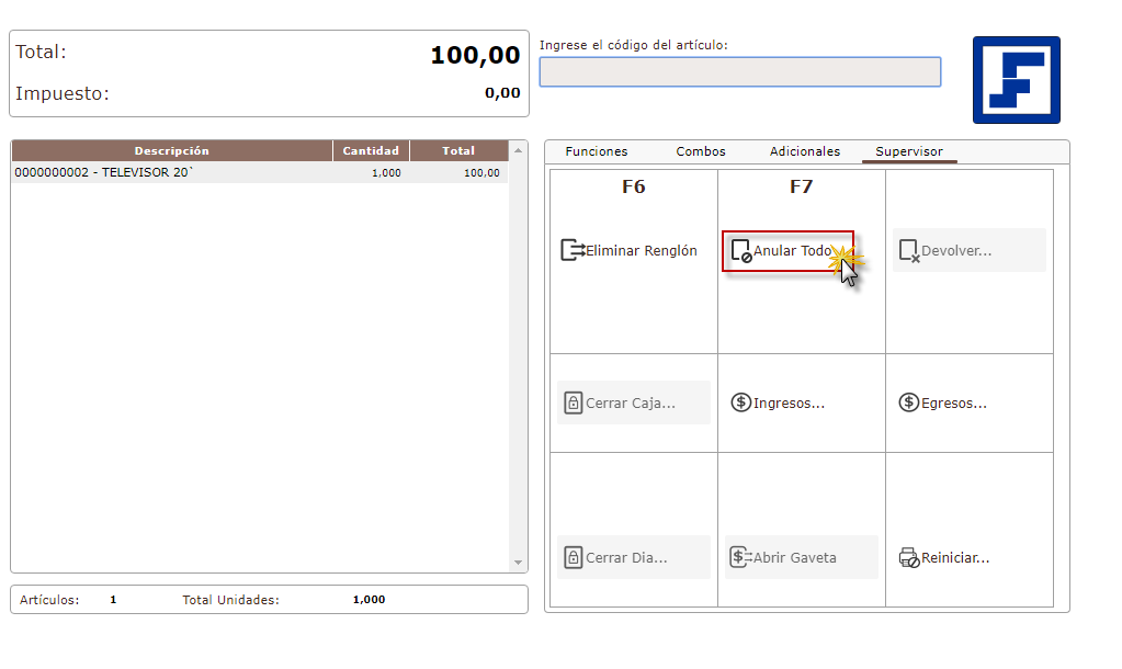 NOTA:Para anular una transacción debe tener al menos consultado un artículo, para así poder realizar la anulación de la transacción.