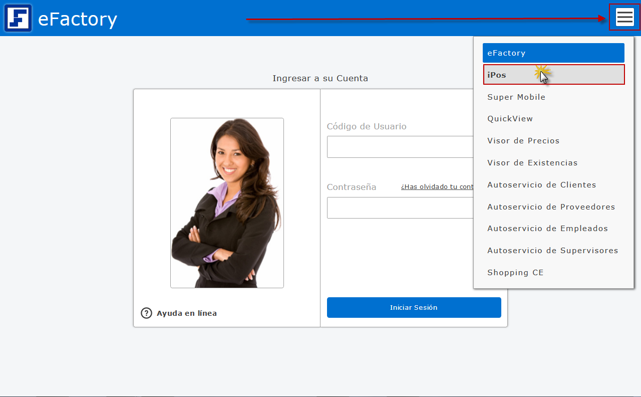 a. Para iniciar en eFactory Punto de Venta, ubicamos en la parte superior derecha el botón