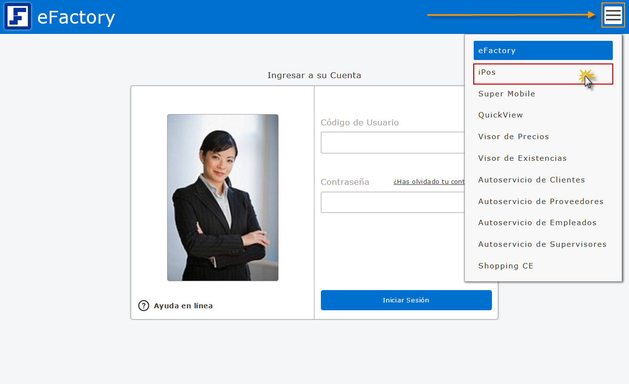 a. Para iniciar en eFactory Punto de Venta, ubicamos en la parte superior derecha el botón