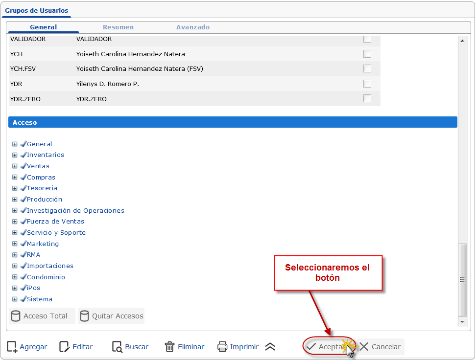 o también puede seleccionar en el cuadro los accesos que le corresponda al usuario.