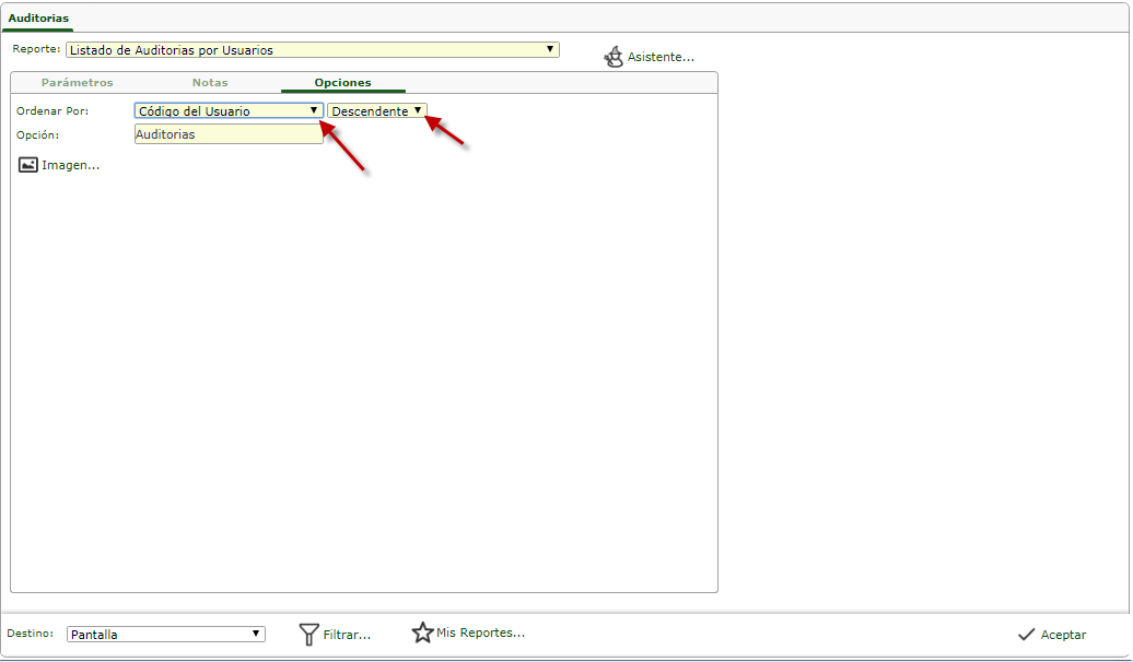 b. Luego podemos observar la ventana donde observamos la ficha donde llenaremos los datos Fecha "Valor Inicial - Valor Final", allí colocaremos las fechas correspondiente para generar la Auditorias y procedemos a presionar el botón de "opciones".