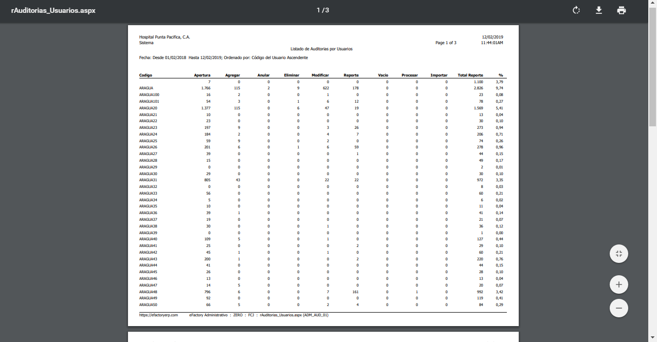 se muestra el reporte de Listado de Auditorias por Usuarios, ordenados de manera descendente.