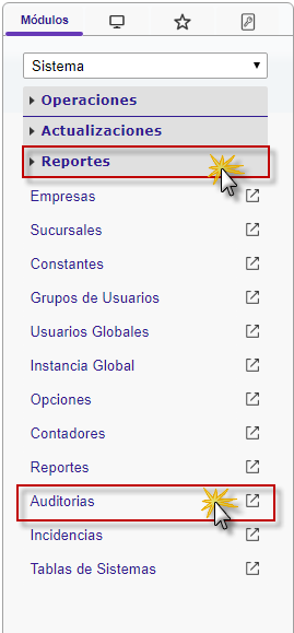 b. En el módulo Sistema, desplegamos el componente Reportes y activamos el sub componente Auditorias.