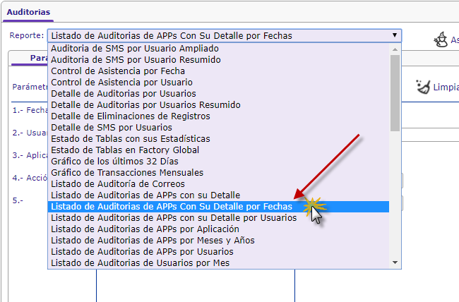 a. Se muestra la ventana de Auditorias, donde Buscaremos el Reportes de "Listado de Auditorias de la APPs con su Detalle por Fechas".