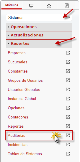 b. En el módulo Sistema, desplegamos el componente Reportes y activamos el sub componente Auditorias.