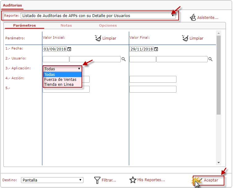 a. Se muestra la ventana de Auditorias, donde Buscaremos el Reportes de "Listado de Auditorias de la APPs con su Detalle por Usuarios".