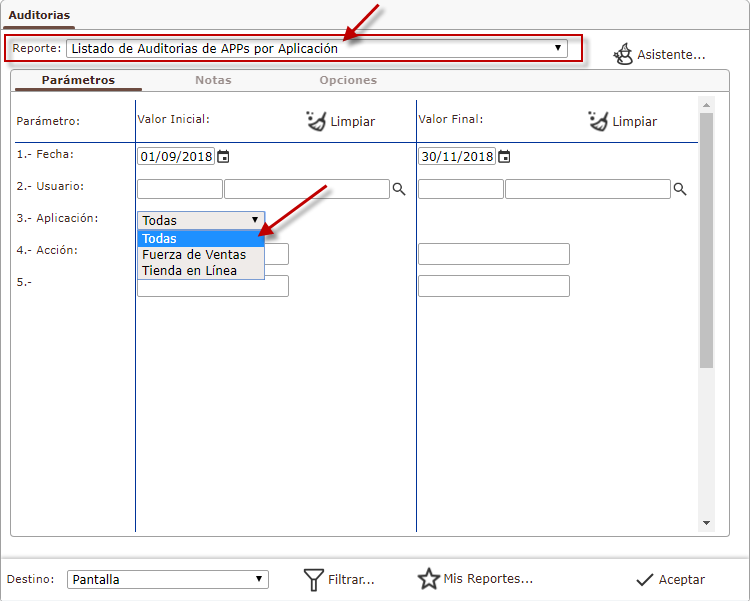 Fecha Valor Inicial, Fecha Valor Final, Usuario y Aplicación donde tenemos tres tipos que son: Todos, Fuerza de Ventas y Tienda en Línea, y Procedemos a presionar el botón