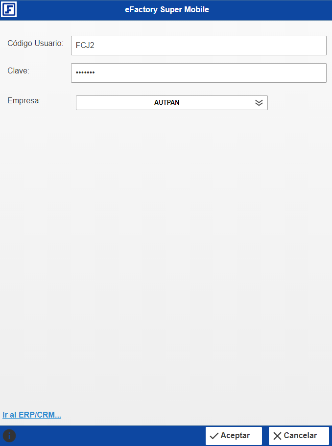 Para iniciar en eFactory Super Mobile tenemos que ingresar con nuestro Usuario y Contraseña y seleccionar el botón