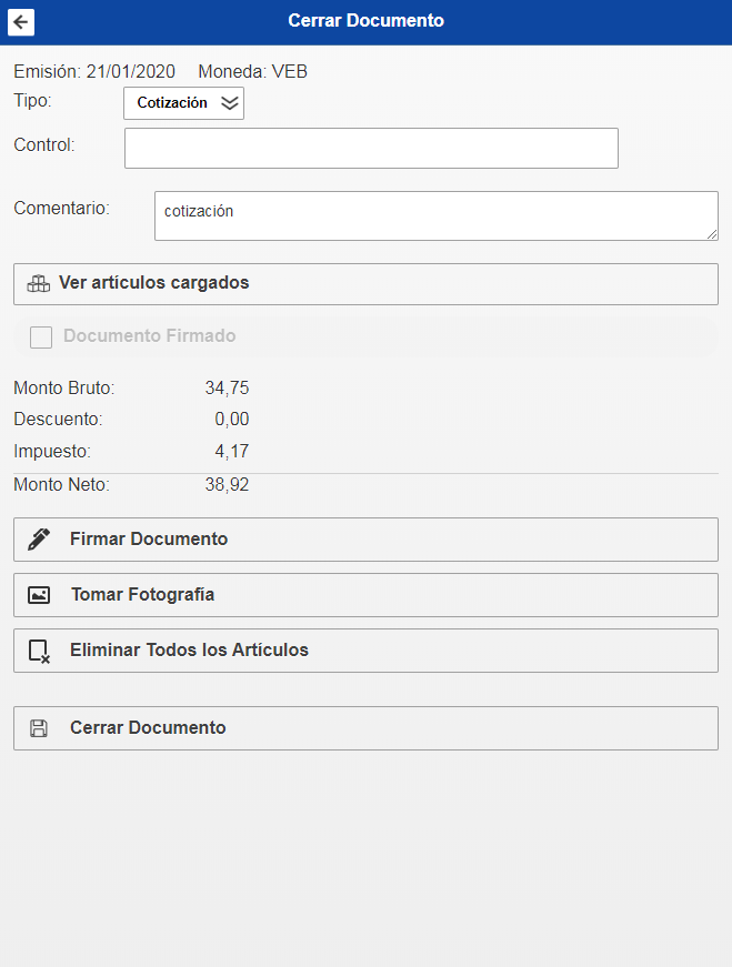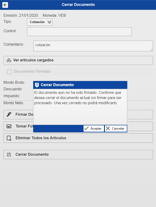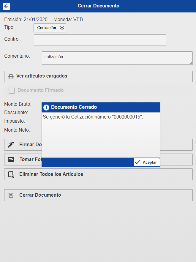 Para Finalizar y agregar la cotización debe hacer click en la opción Cerrar Documento, esto le mostrará un mensaje de confirmación en el cual debe presionar aceptar y se habrá agregado la cotización.