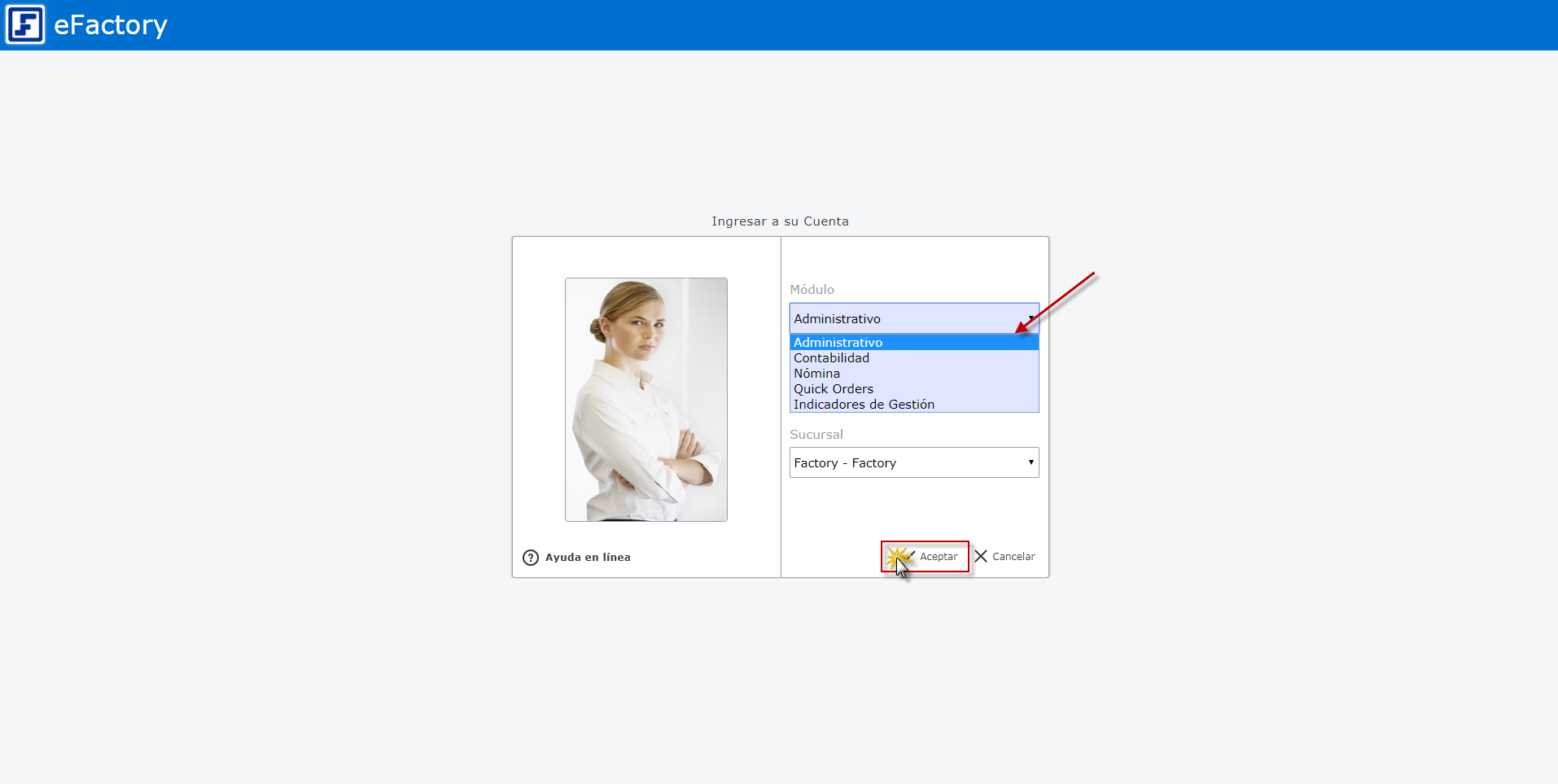 a. Al iniciar eFactory con nuestro Usuario y Contraseña, se procede a Seleccionar el módulo Administrativo,