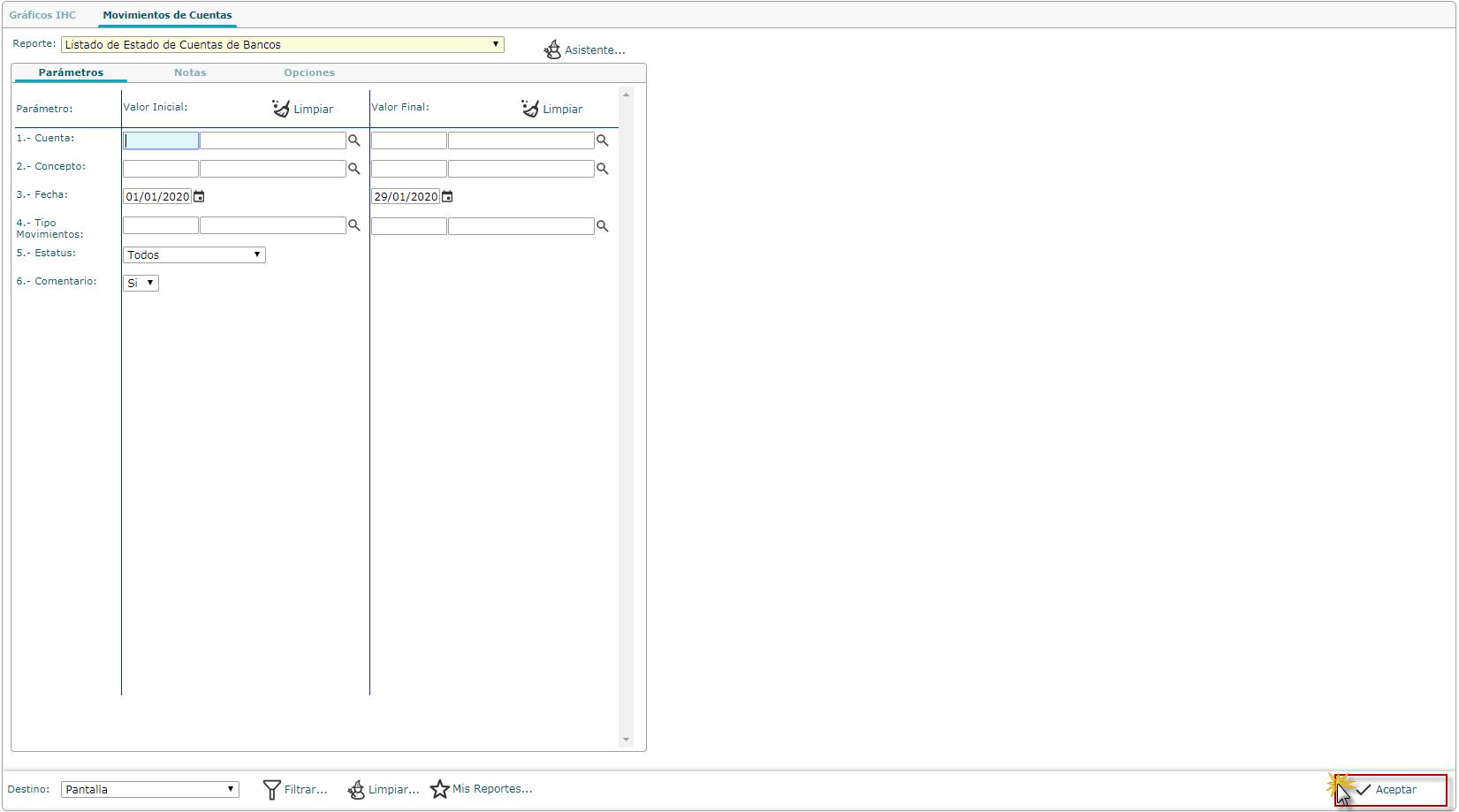 a. Al seleccionar el maestro correspondiente nos muestra la ventana donde ubicamos el campo Reportes y se desplegara un panel en el cual deberemos desplegar la lista que reportes que se encuentran disponibles como lo muestra la imagen, luego seleccionaremos "Listado de Estado de Cuentas de Bancos".