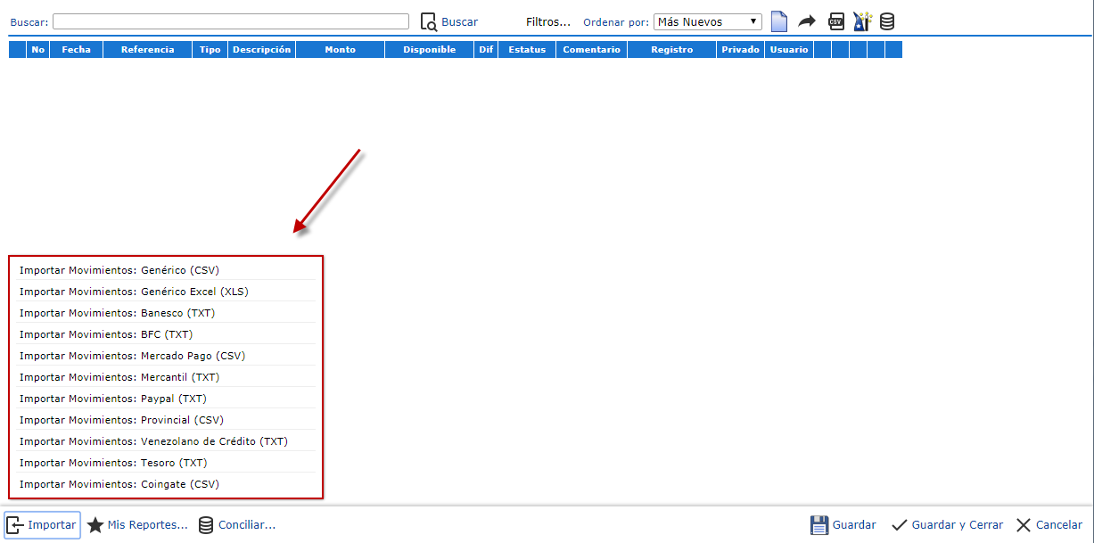 NOTA: Si no se encuentra el banco entre la lista que ya existe debera presionar la primera opción "Génerico(CSV)"