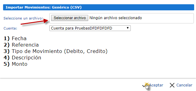 c. Al presionar el banco deseado se nos desplegara una pequeña ventana, en la cual nos especificara EL ORDEN EXACTO EN EL CUAL DEBE IR EL TIPO DE ARCHIVO QUE FUE ENVIADO POR EL BANCO. Deberemos cargar el archivo en la casilla "Seleccionar Archivo", seleccionamos la cuenta a la cual se le hara la conciliación y presionamos
