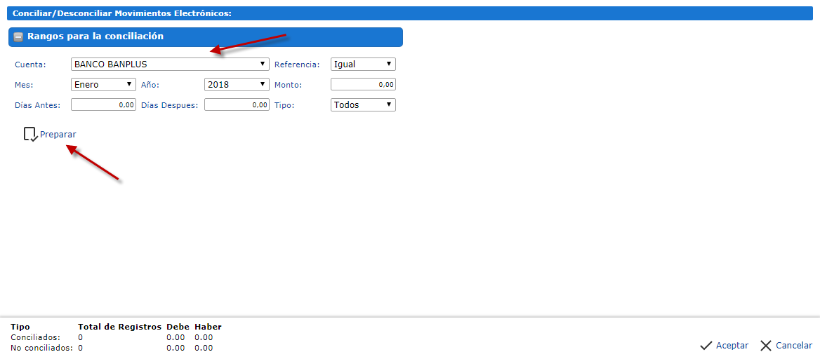 , y se nos abrira una pequeña ventana en la cual deberemos elegir la cuenta a la cual vamos a conciliar y deberemos establecer los parametros que se encuentran siguiente de este, para finalizar presionaremos